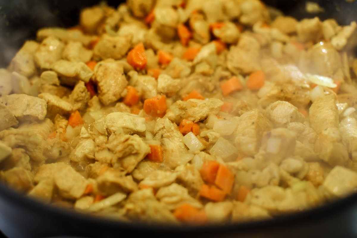 - Pour chicken broth into the pan and use a wooden spoon to scrape up browned bits from the bottom of pan. Add carrots, potatoes and cauliflower to the pot along with along with another pinch of salt and pepper and the remaining 1 tablespoon curry powder. Stir well then bring to a boil. Reduce heat to low then simmer for 30 minutes.