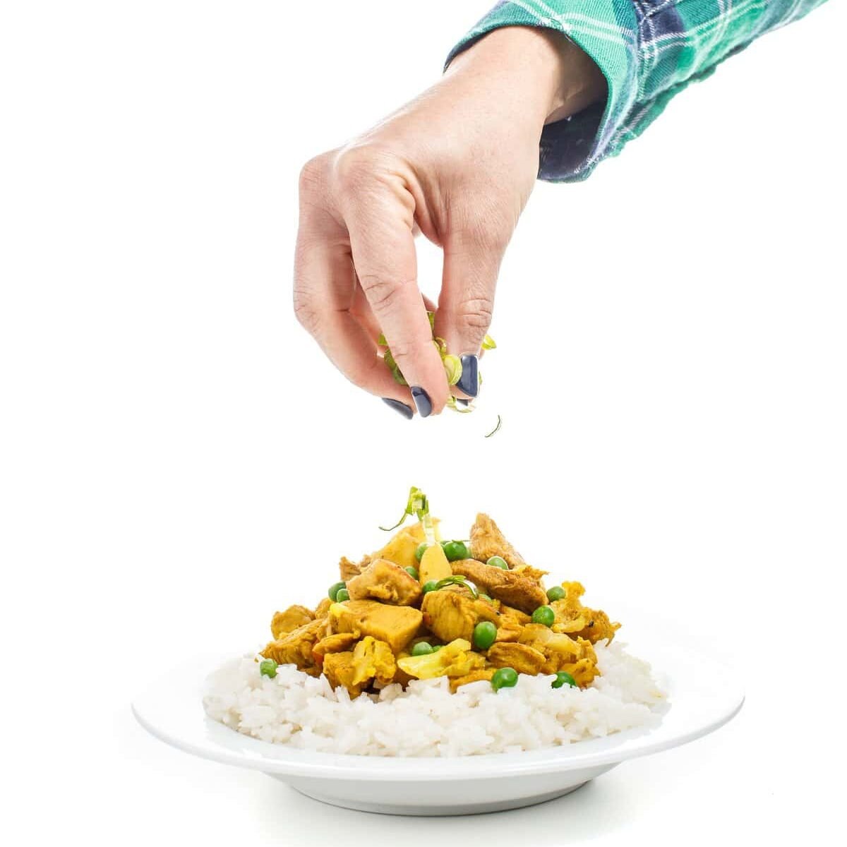 - In a medium bowl, toss chicken cubes with 1 tablespoon of the curry powder and a good pinch of salt and pepper.