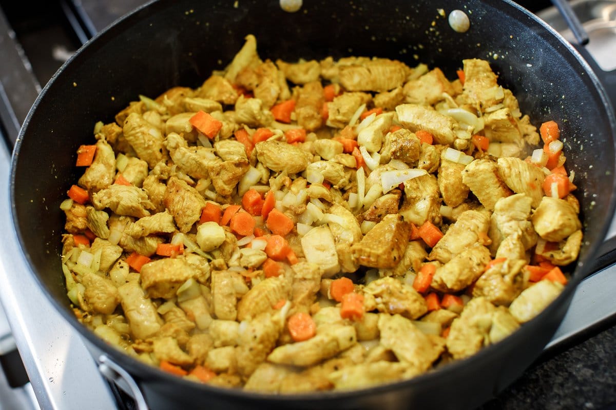While not customary, I decided to bulk up the curry with additional veggies including cauliflower, potatoes, carrots and peas. Feel free to add in any veggies you have on hand. You can also omit the veggies entirely and keep it more traditional.