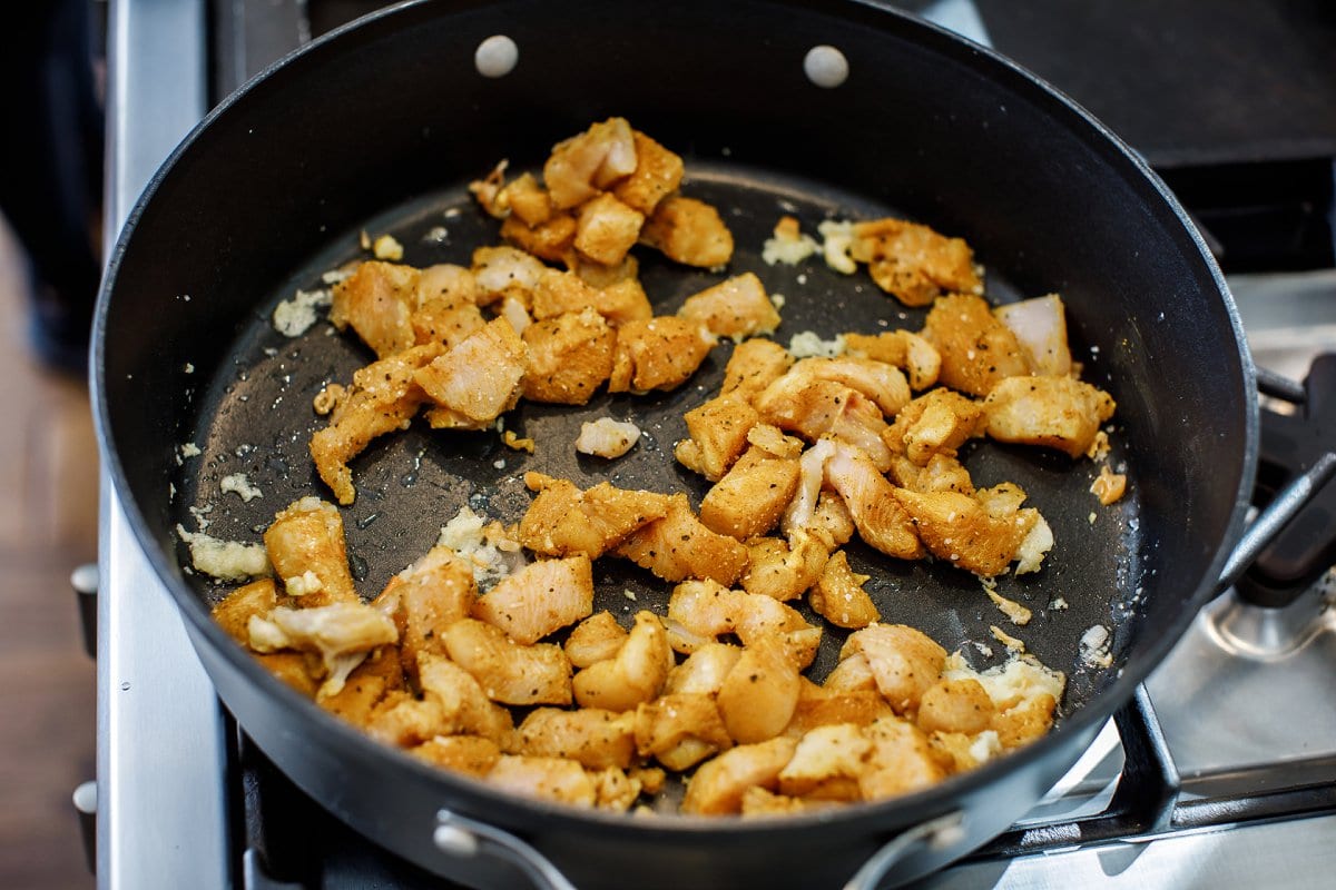 - Add chicken to the pan and saute until browned, about 5-7 minutes, stirring frequently.