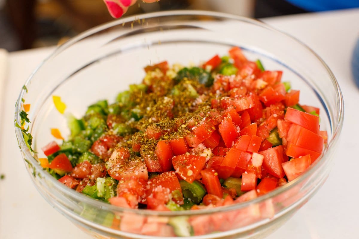 - Place all the vegetables and herbs in a large bowl and drizzle with lemon juice and olive oil. Add garlic, za'atar, salt, and pepper then toss well. Check for seasoning and adjust accordingly.