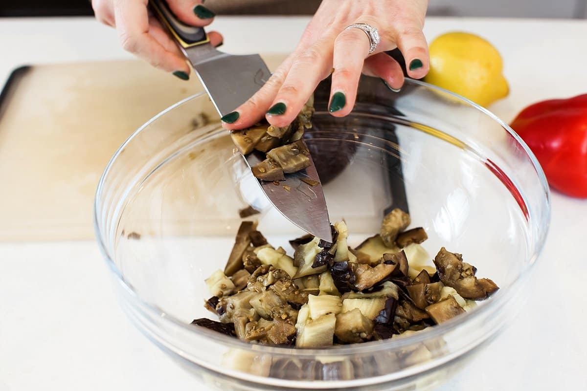 When eggplant is done baking, let cool, then use a knife to peel and cut into small cubes.