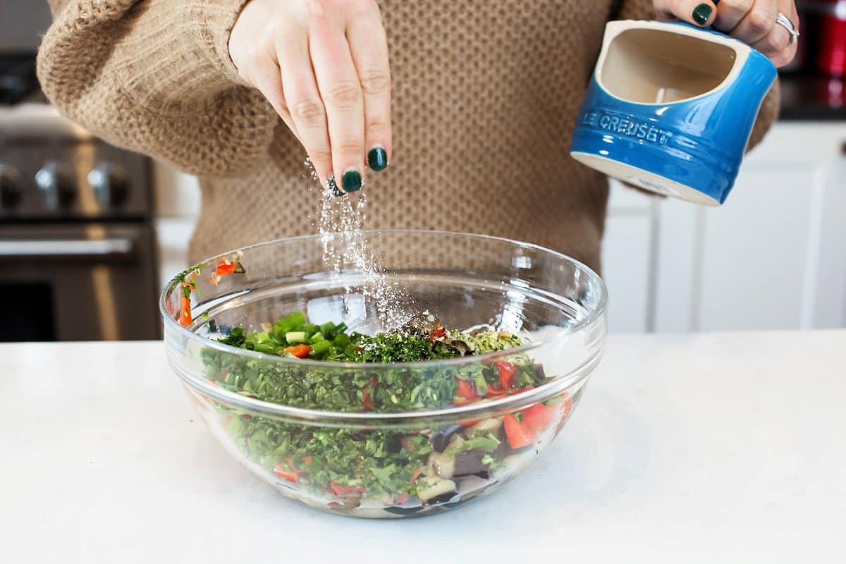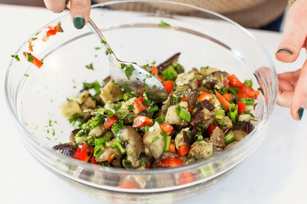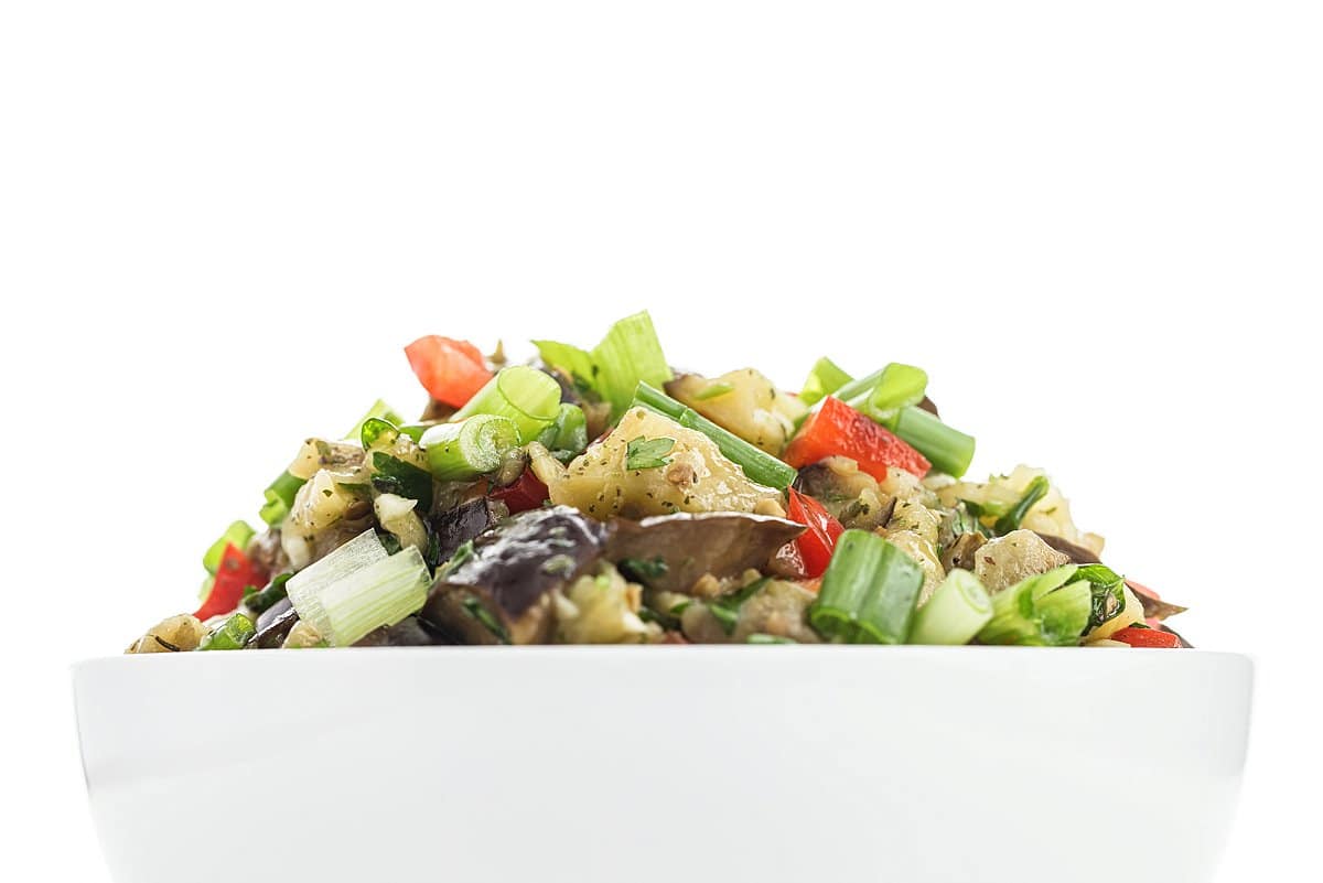 I bet you never thought there were so many ways to enjoy eggplant, did you? It’s one of my favorite foods to use in flavorful dishes because it’s spongy texture soaks everything up so well. I commonly use it in my Middle Eastern cuisine, and that applies to my Lebanese Eggplant Salad. While eggplant is much better cooked, it doesn’t have to be served hot! In this chilled salad, the eggplant is roasted ahead of time to give it that smoky flavor, before cooling, dicing, and tossing with the rest of the ingredients.