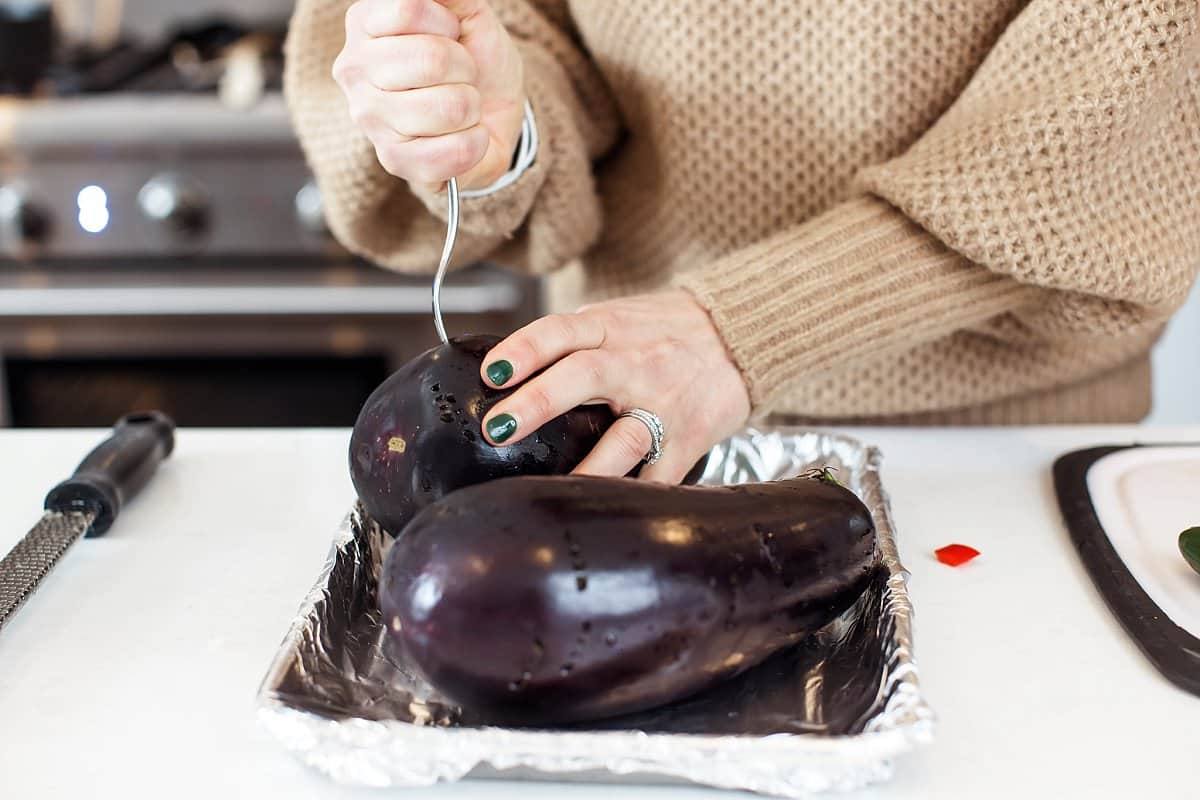 Start your Lebanese eggplant salad by taking your eggplants and poking them with a knife or fork. Then bake them in the oven at 350 for about 30 minutes, or until tender.