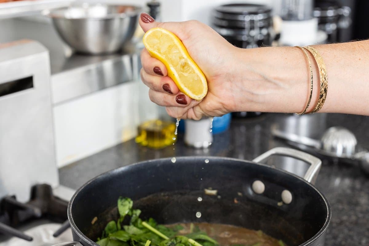 3. Right before serving, stir in the spinach and cook until bright green and wilted, about 2 minutes. Season with additional, salt, pepper and lemon juice to taste before serving warm.
