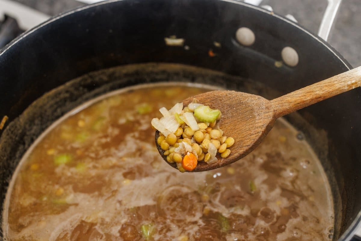Then add the lentils to the pot and toast for a couple minutes before adding the chicken broth and water. Reduce heat and simmer for about 45 minutes, or until lentils are tender.