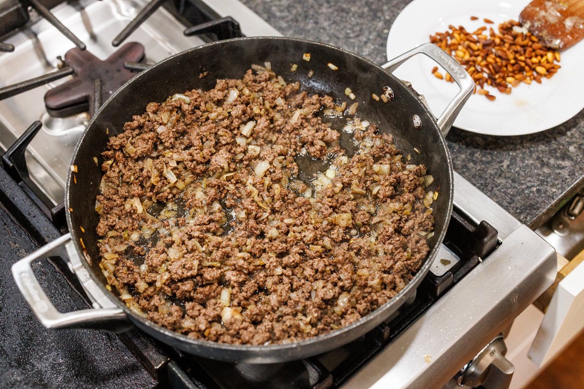 Add the cinnamon and allspice, along with some more salt and pepper to taste, and cook until meat is fully browned and onions are soft and caramelized. Turn off the heat, and stir the lemon juice and pine nuts into the meat mixture.