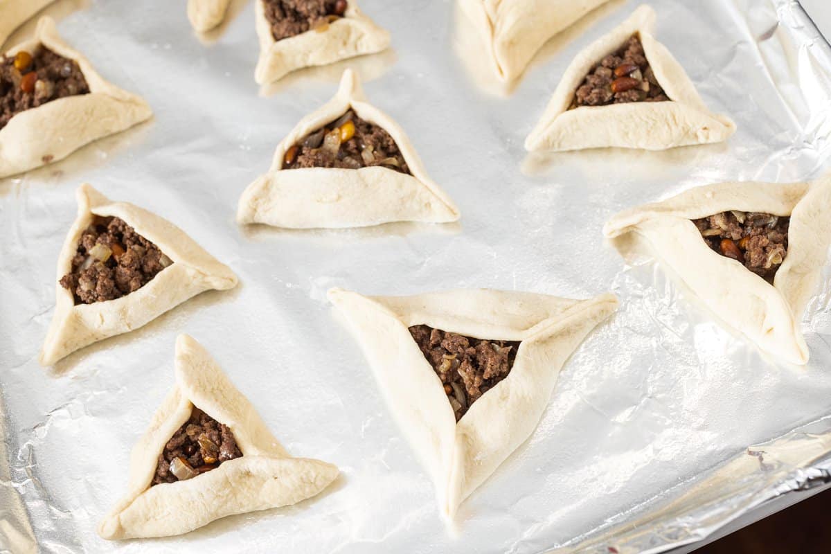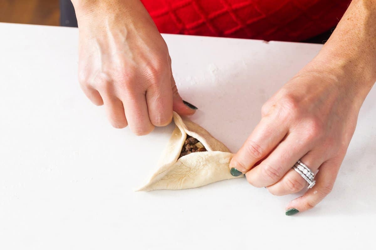 - To begin folding the dough into a triangle, bring the bottom third up over the meat then bring another third of the dough to the first fold and pinch together to form a tight seal. Fold the final third over and pinch with the first two thirds of the dough to create a tightly pinched triangle. Repeat until you run out of dough.