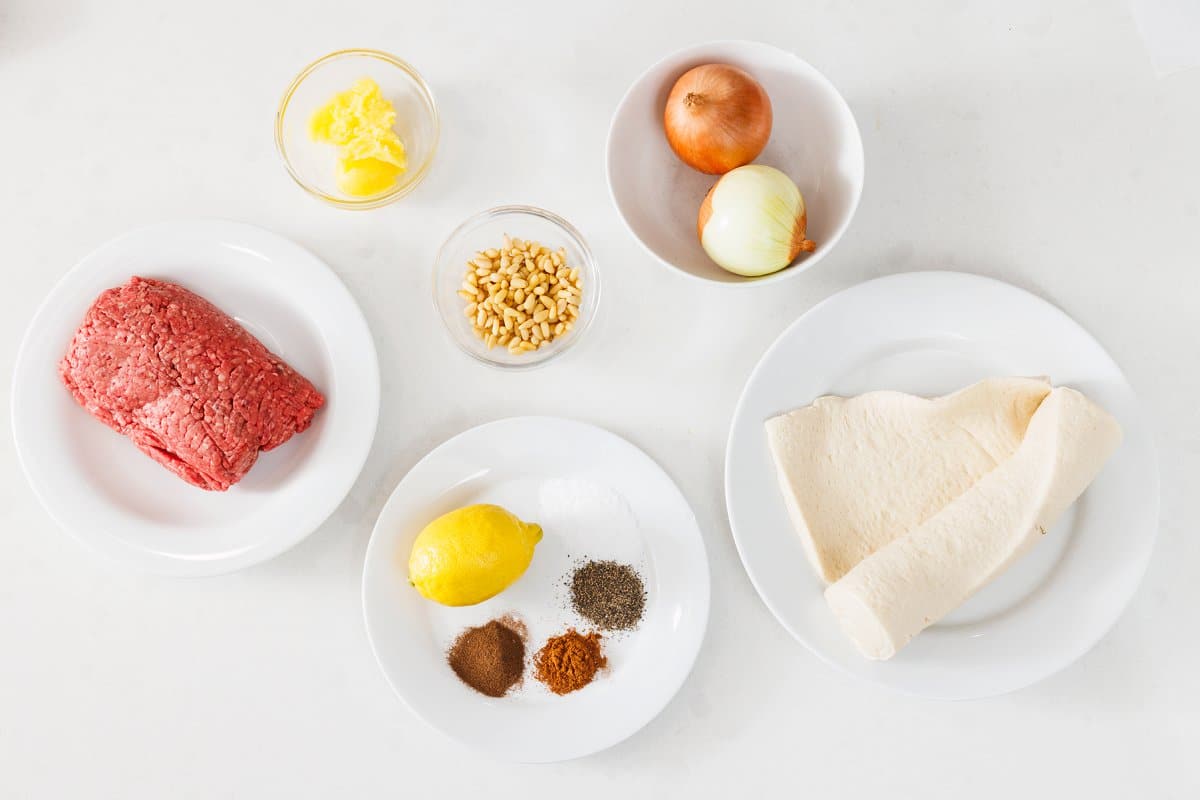 - In a large pot, brown pine nuts in ghee until golden brown being, careful not to burn. Remove nuts from pan, but leave any remaining butter. Add ground meat, onions, salt, pepper, cinnamon and allspice to the pan and cook until meat is browned – about 8-10 minutes. Remove from heat and stir in toasted pine nuts, yogurt, and lemon juice. Let mixture cool slightly.1/4 cup pine nuts, 2 tablespoons clarified butter, 1 pound ground sirloin or lamb, 2 medium onions, 2 teaspoons salt, 1/2 teaspoon pepper, 1/2 teaspoon cinnamon, 1/2 teaspoon allspice, 1/2 cup plain yogurt, 1 juice of lemon