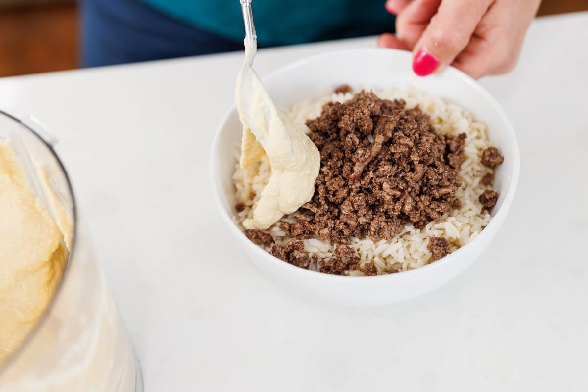 Once everything is cooked and ready, put the Minute Rice in a bowl, topped with the ground beef and a dollop of hummus. I like to make my own hummus, but storebought works as well!