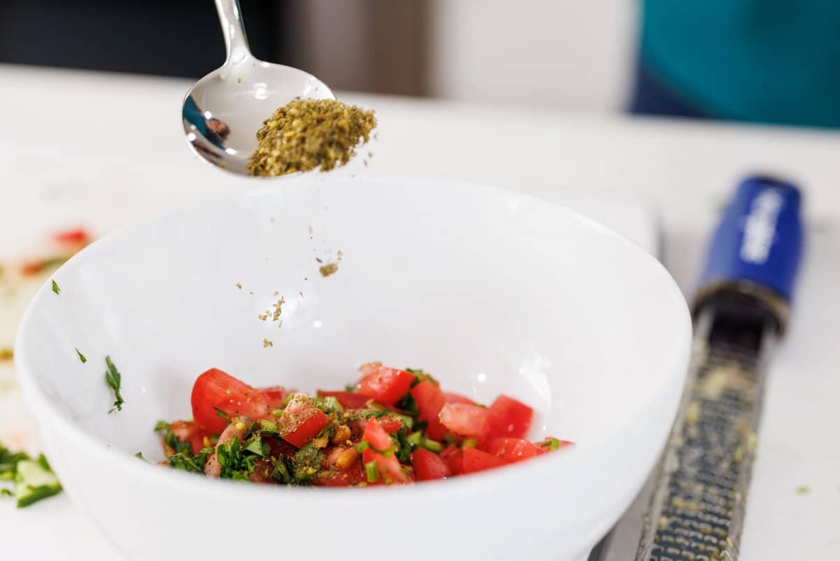 Next you’ll make your tomato salad. Add diced tomated to a small bowl, then add the za’atar and parsley.
