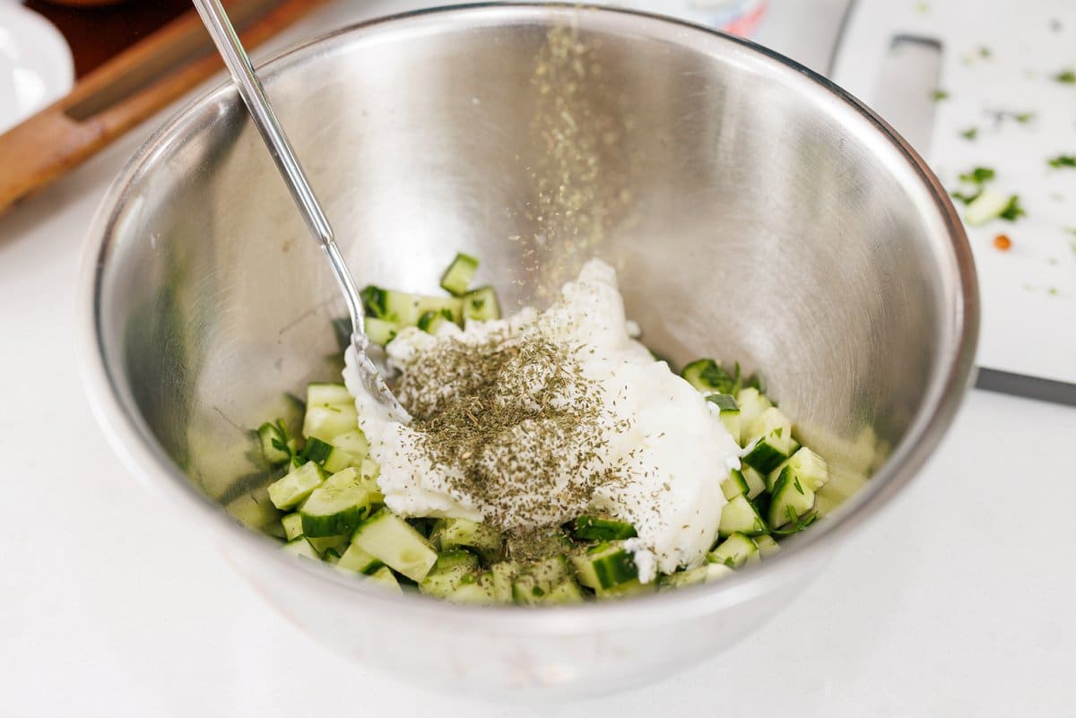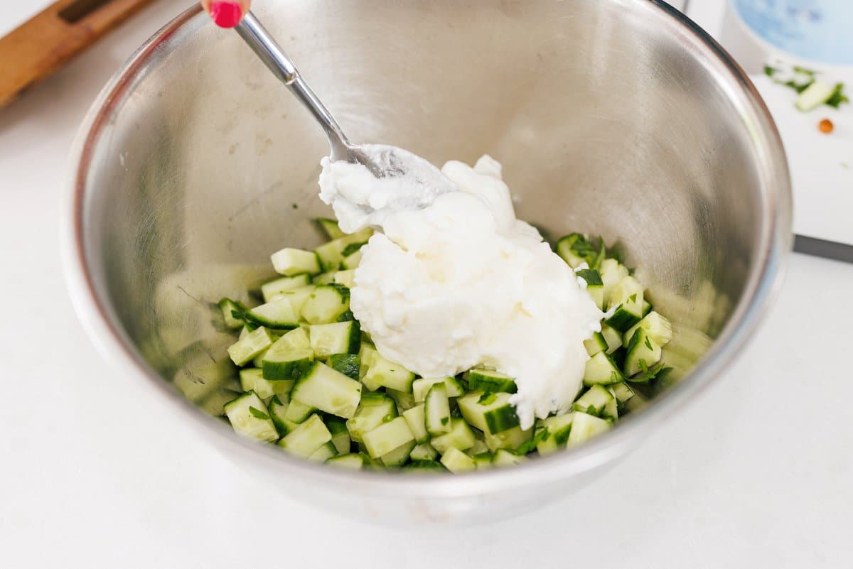 Start your Lebanese Rice Bowls with Hummus by making the Lebanese yogurt sauce (laban). Mince a cucumber and put it in a medium sized bowl, then add the plain yogurt.