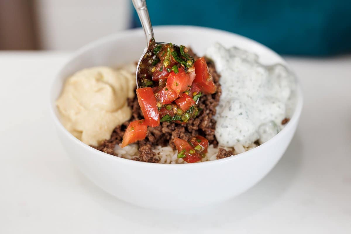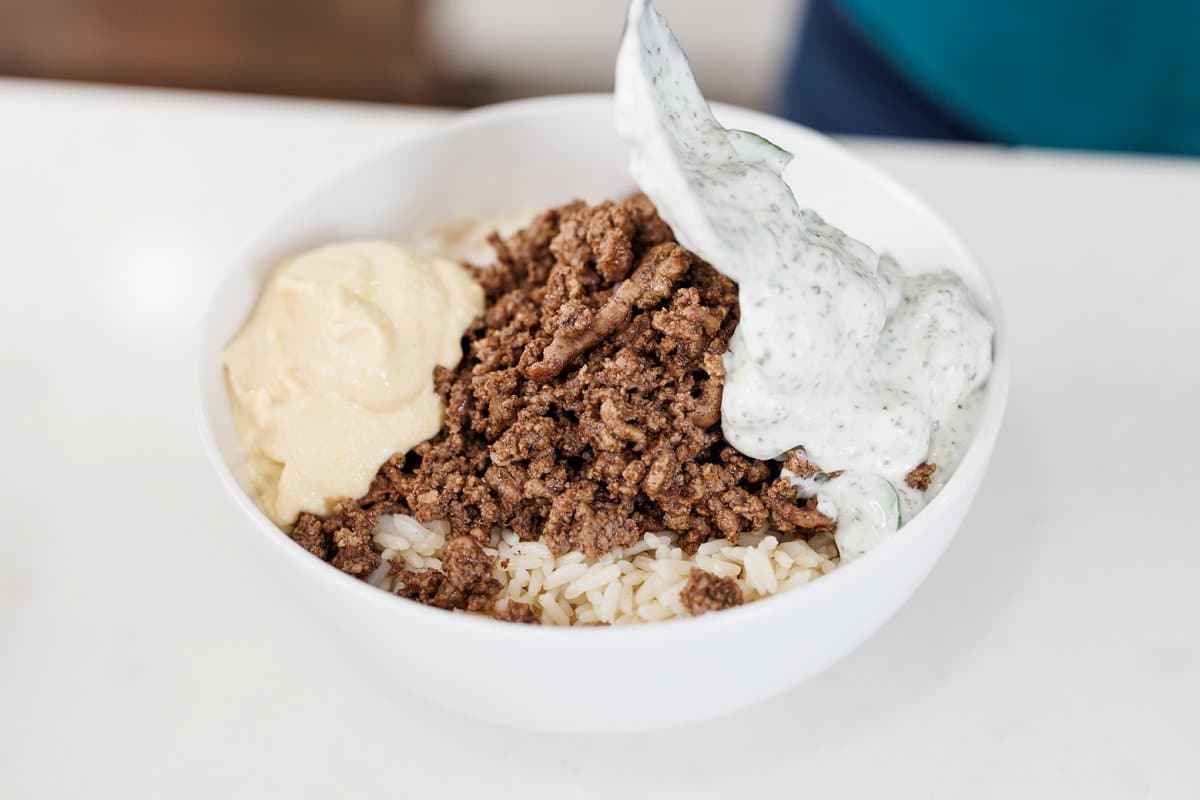 These Lebanese rice bowls are topped with seasoned beef, garlicky hummus, cucumber yogurt sauce and more. The ultimate meal-in-a-bowl!