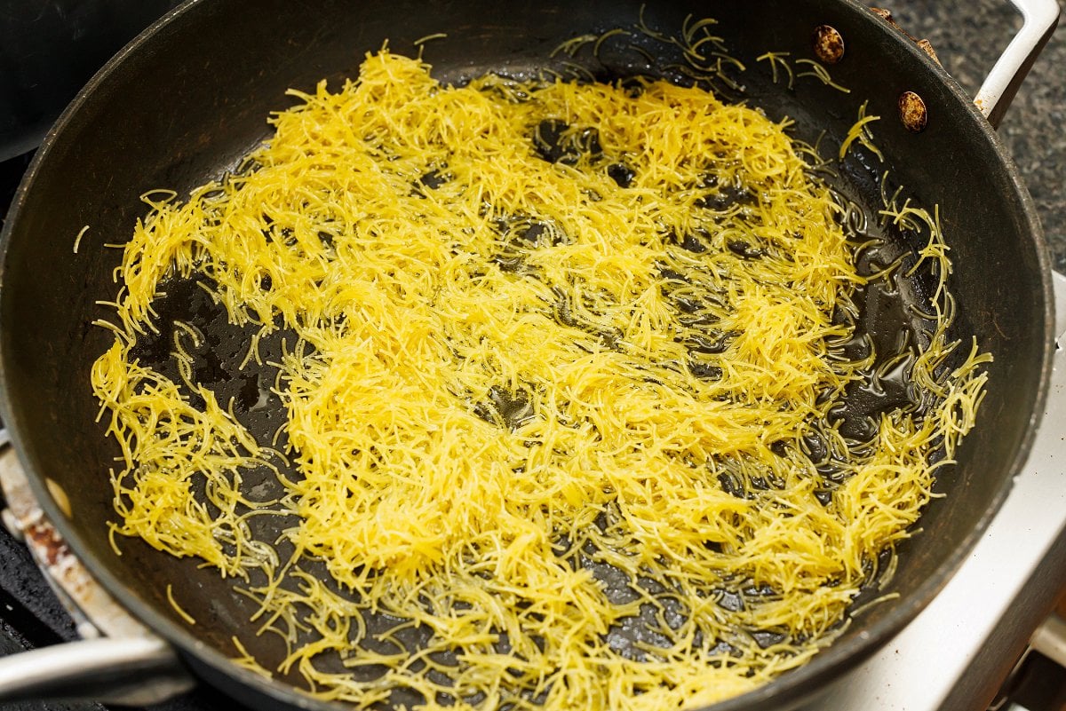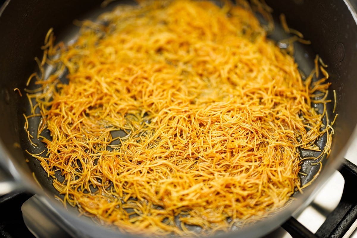 2. In a large, deep pan heat the butter over medium heat until melted. Add the broken vermicelli pasta and brown, stirring frequently, until it is golden/dark brown. Be careful to not let burn – don't walk away from the pan. This takes about 4-5 minutes.