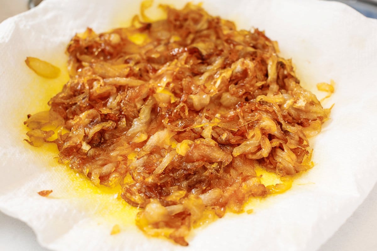 Once the onions are caramelized, remove from the pan and let strain on a plate lined with paper towel. This will help remove any excess oil.