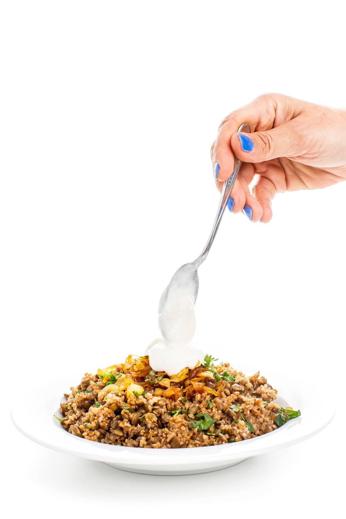 To serve, you’ll top each bowl of lentils and bulgur wheat with caramelized onions. If you have fresh parsley and plain yogurt, I highly recommend that as well.