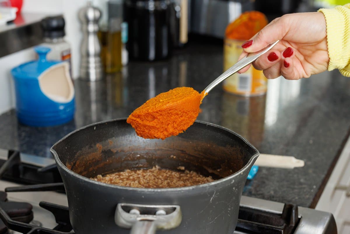 Once liquid is absorbed by the oats, add in the pure pumpkin.