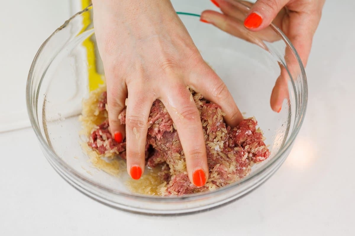 Step 1. Take your ground sirloin and add the rice to start you filling.