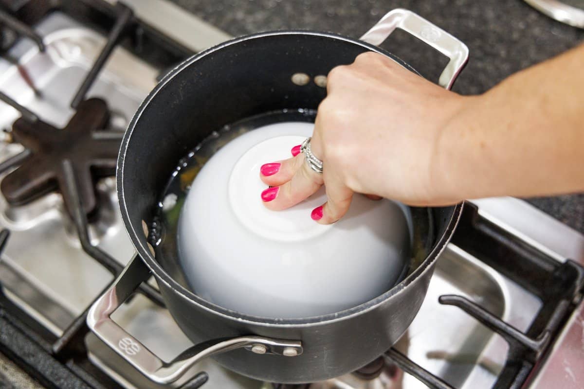 7. Cover grapes leaves with a small plate turned upside down to keep them from moving and to weigh it down.