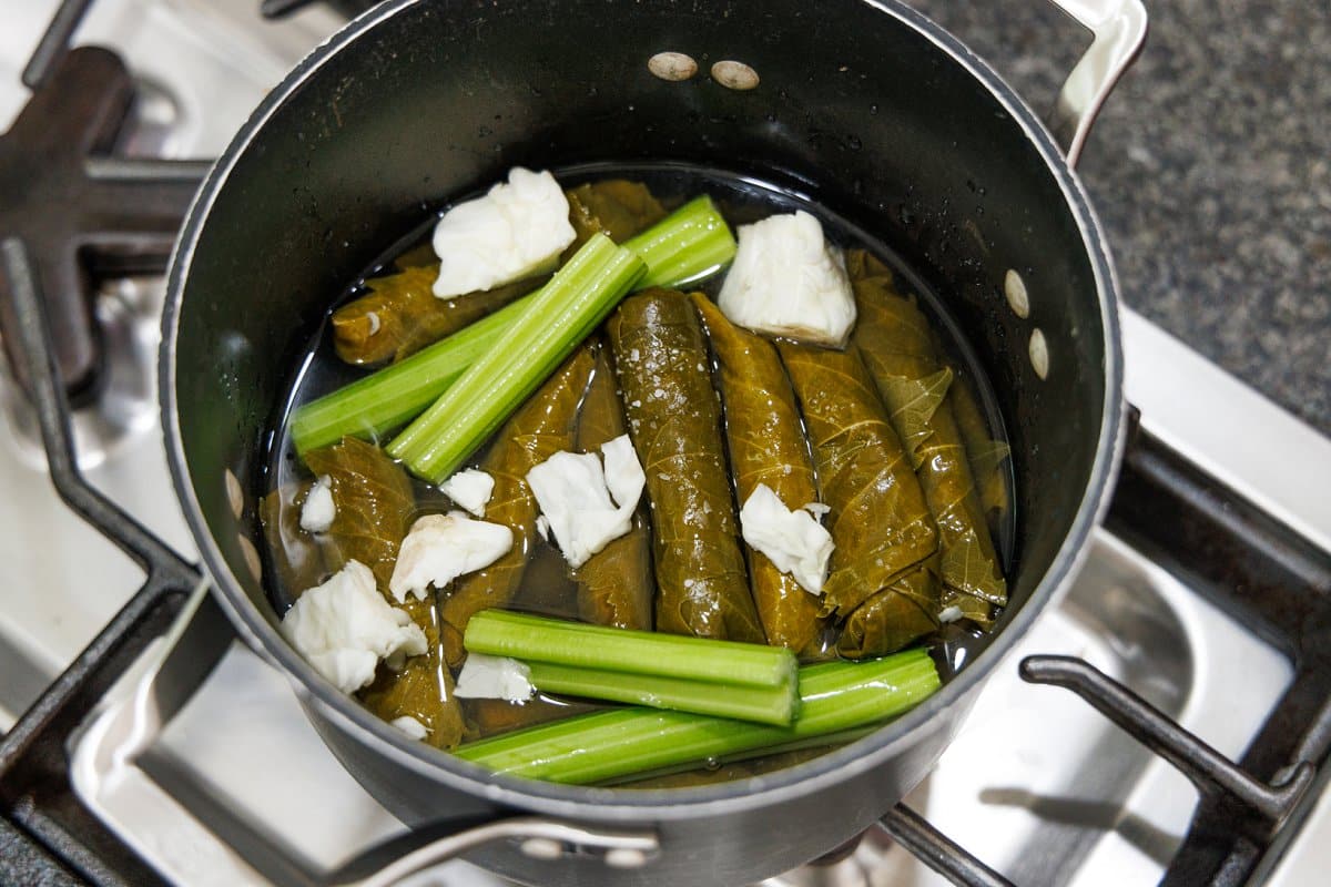 While you can cook them without it, traditionally grape leaves are cooked in a pot lined with cabbage leaves and with some stalks of celery, for some added flavor. The cabbage leaves also ensure your grape leaves never touch the bottom of the pot, making sure you don’t burn or singe any.