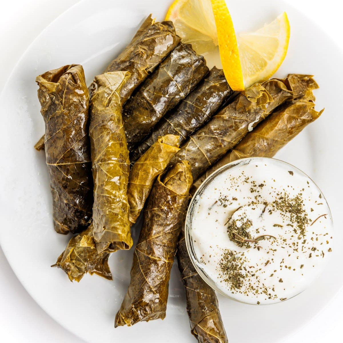 Lebanese meat stuffed grape leaves on a plate with a little bowl of cucumber laban.