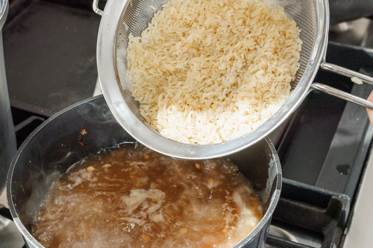 Then add your rice as well as some salt and pepper to taste. Bring back to a boil and stir to combine, then cover with a lid and reduce the heat down to a simmer until fully cooked and liquid is fully absorbed.