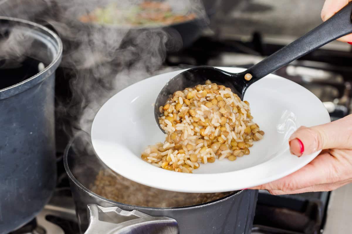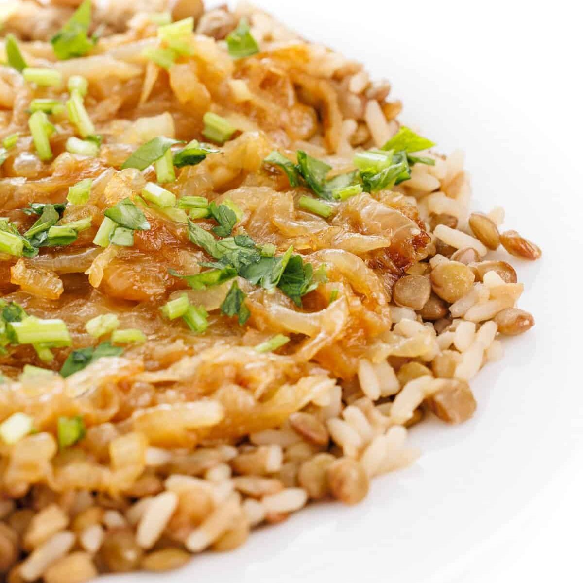 - Fluff lentils and rice with a fork before serving with caramelized onions. Serve with plain yogurt or Lebanese Cucumber Laban if you wish.