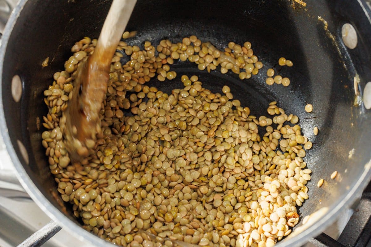 - In the same pan, add lentils and increase heat to medium-high. Toast lentils for 60 seconds then add 6 cups water. Bring pot to a boil then reduce heat to low and simmer until lentils are halfway cooked, about 15 minutes.
