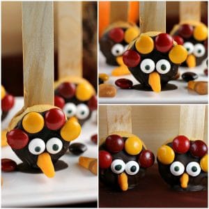 Nilla Wafer Thanksgiving Turkeys are cookies sandwiched together with peanut butter, dipped in chocolate, and decorated with fall colored M&Ms, candy corn, and candy eyes, all on a popsicle stick! So fun for the kids and festive for the Thanksgiving table!
