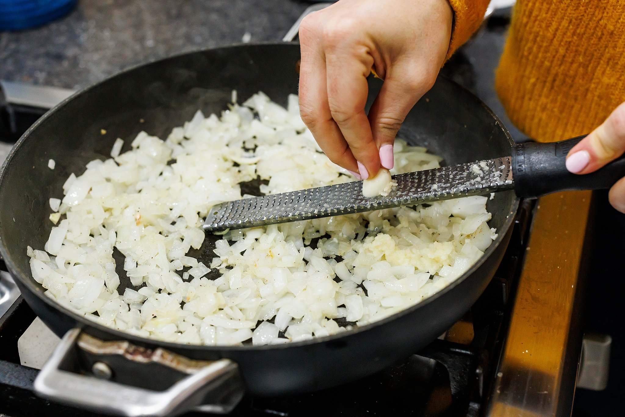 • Onion: White onion caramelizes quickly and deliciously, while being mostly mild in flavor and pairs well with most veggies and proteins.