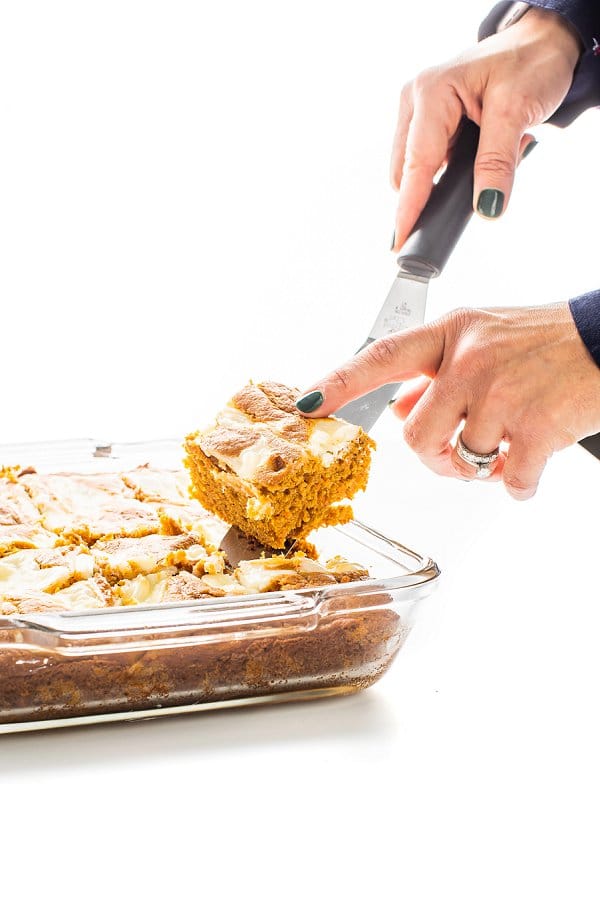 This pumpkin bar recipe knocked my socks off. I usually make the same pumpkin bread every year but I wanted to try something different with pumpkin. It is moist and has great flavor from all the spices and the cream cheese was perfect and didn’t over power the pumpkin. The hubby loved it. I gave him a fork with his piece and he said I don’t need a fork.