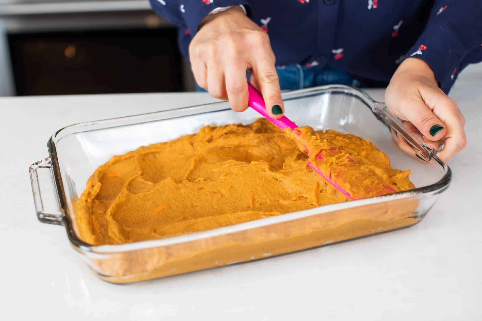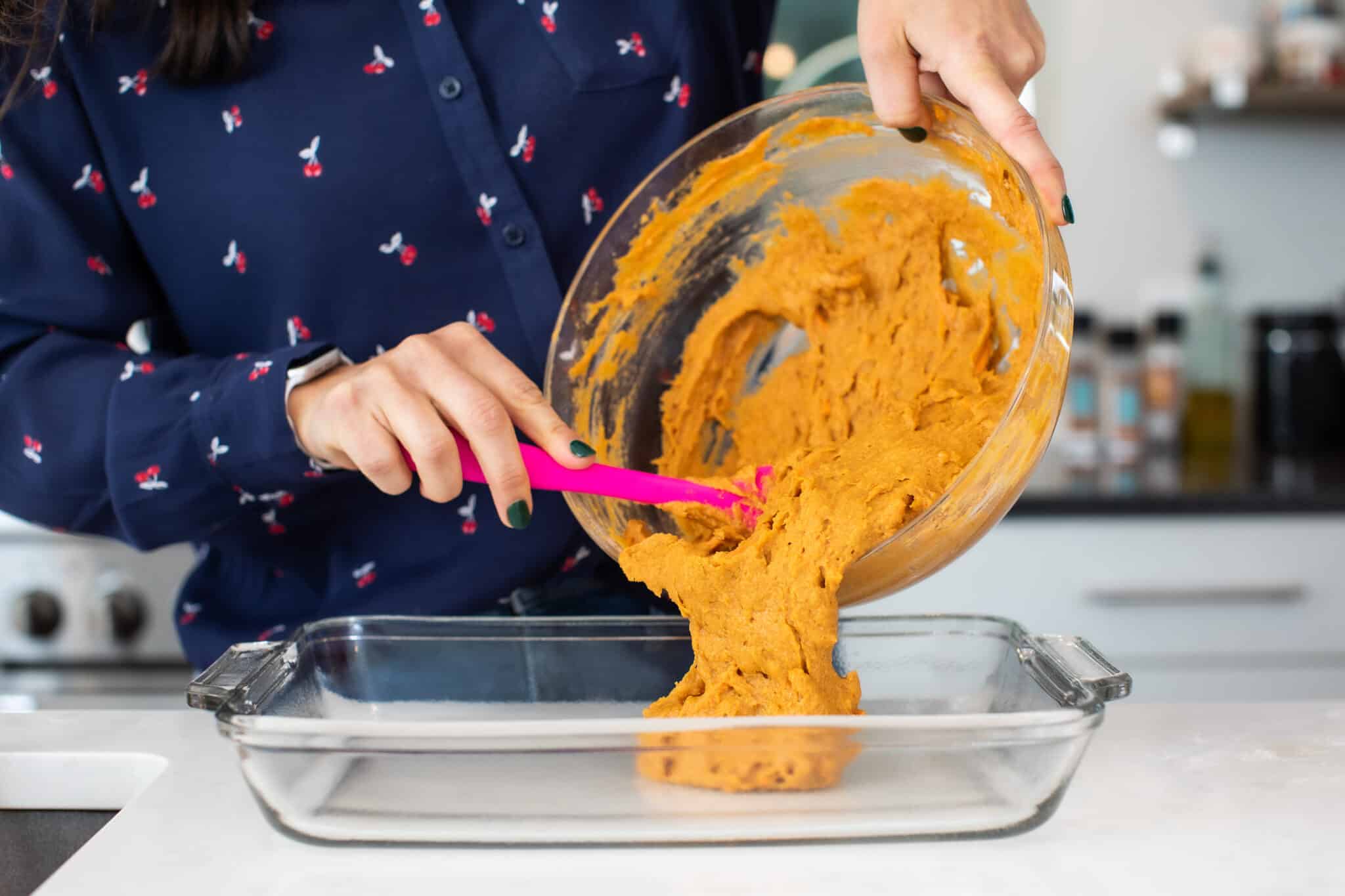 Then take your pumpkin mixture and spread it evenly in a prepared baking dish.