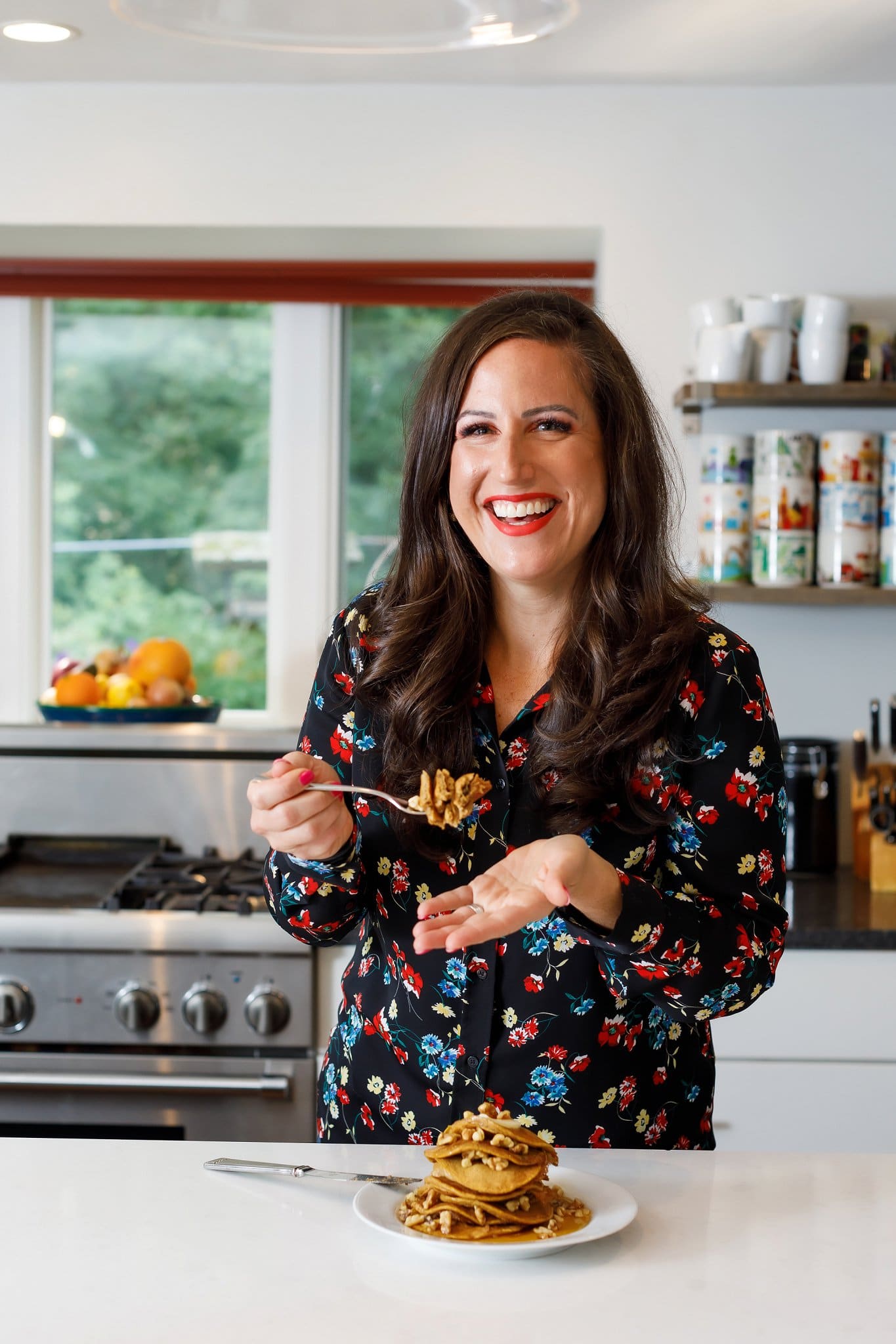 Personally, I love to top the whole stack with chopped pecans in order to add protein and texture. However, walnuts or sliced almonds are delicious, too! Feel free to add fruit, nuts and seeds, nut butters, or whipped cream!