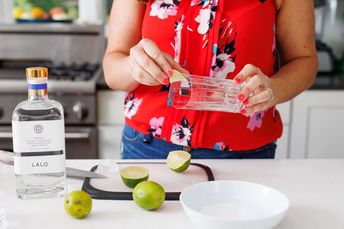 Start your Ranch Water Cocktail by making your chili lime salt rim. on your highball glass. While optional, I love the little flash of color and spicy flavor it gives.