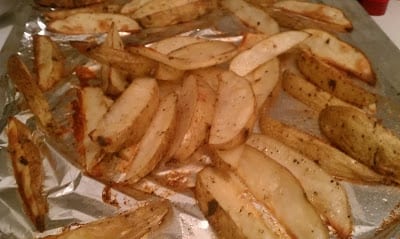 - Slice the potatoes into wedges, approximately 8 per potato.4 large russet potatoes