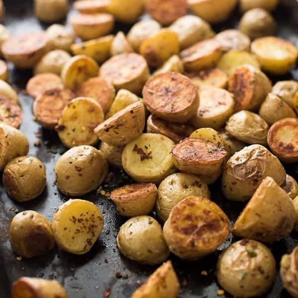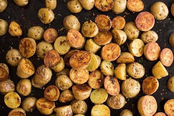 Creamy potatoes are halved then roasted with olive oil, rosemary, garlic and salt. A fast and easy five-ingredient side dish recipe!