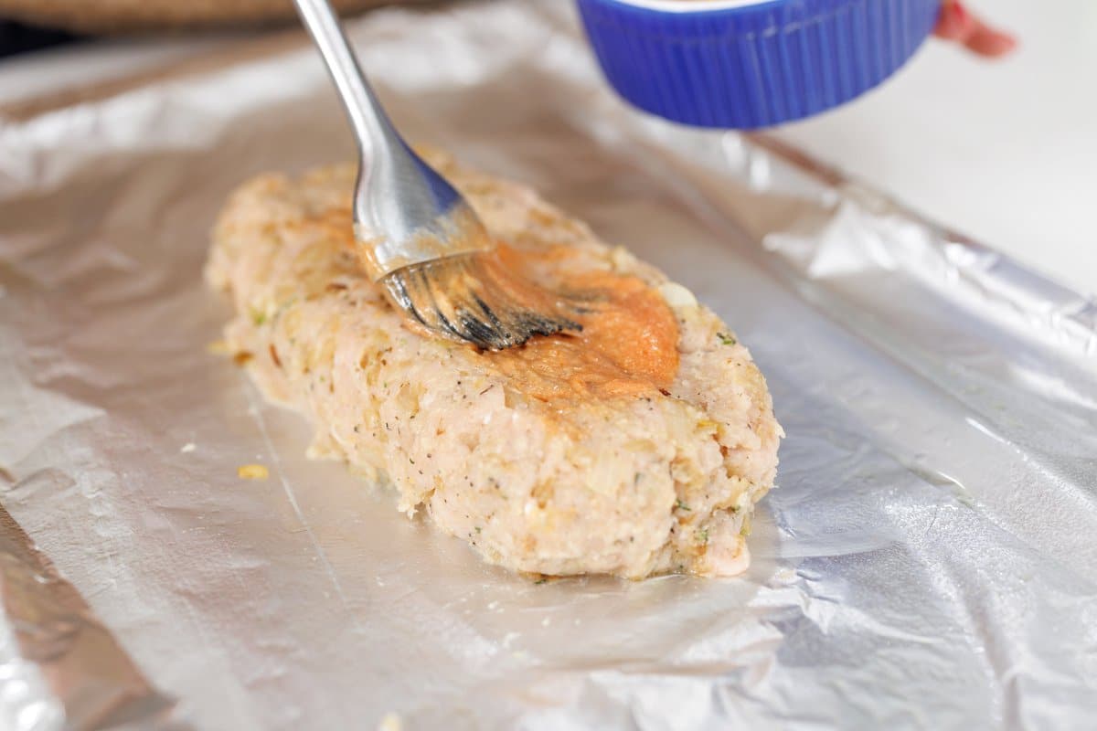 - Form meat mixture into a loaf on the pan then gently spread ketchup and mustard over the top.