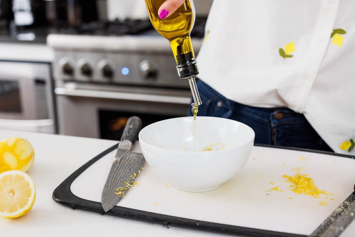 - Meanwhile, mash together lemon zest, olive oil, oregano, garlic, salt and pepper in a small bowl.