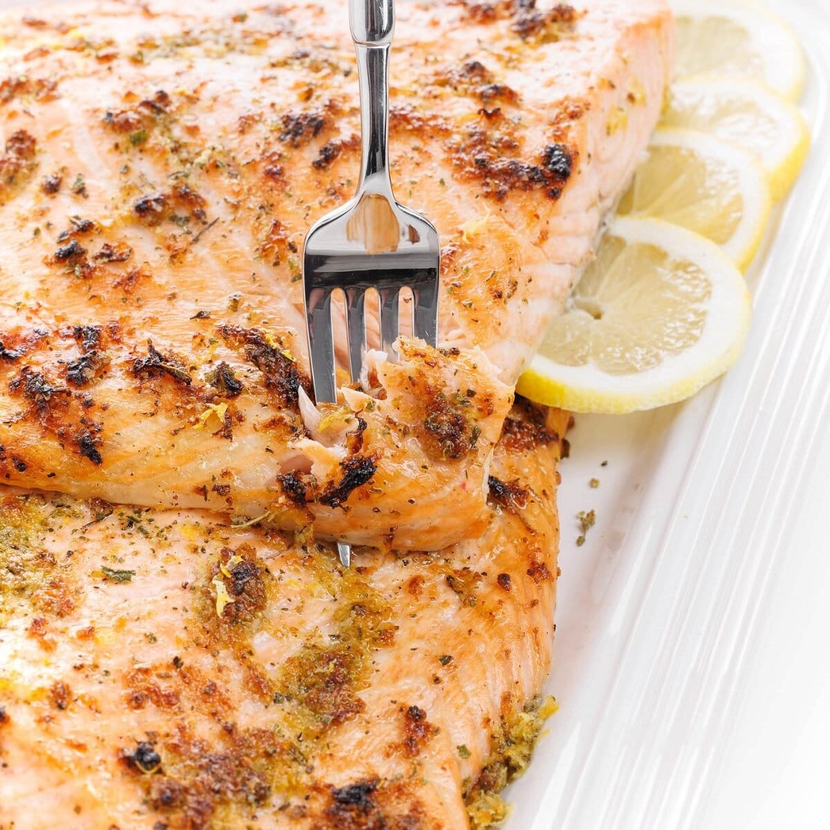 Salmon pairs well with so many herbs and spices. Common ones include oregano, parsley, rosemary, cilantro, thyme, and basil.