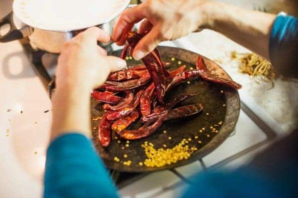 Passed down over the generations, this recipe was taught to me in person by my photographer’s mother, Gloria. That’s her above toasting the chiles in a dry pan. By gently toasting them, the flavors start to develop and a warm, smoky aroma starts to release from the oils within the chiles.