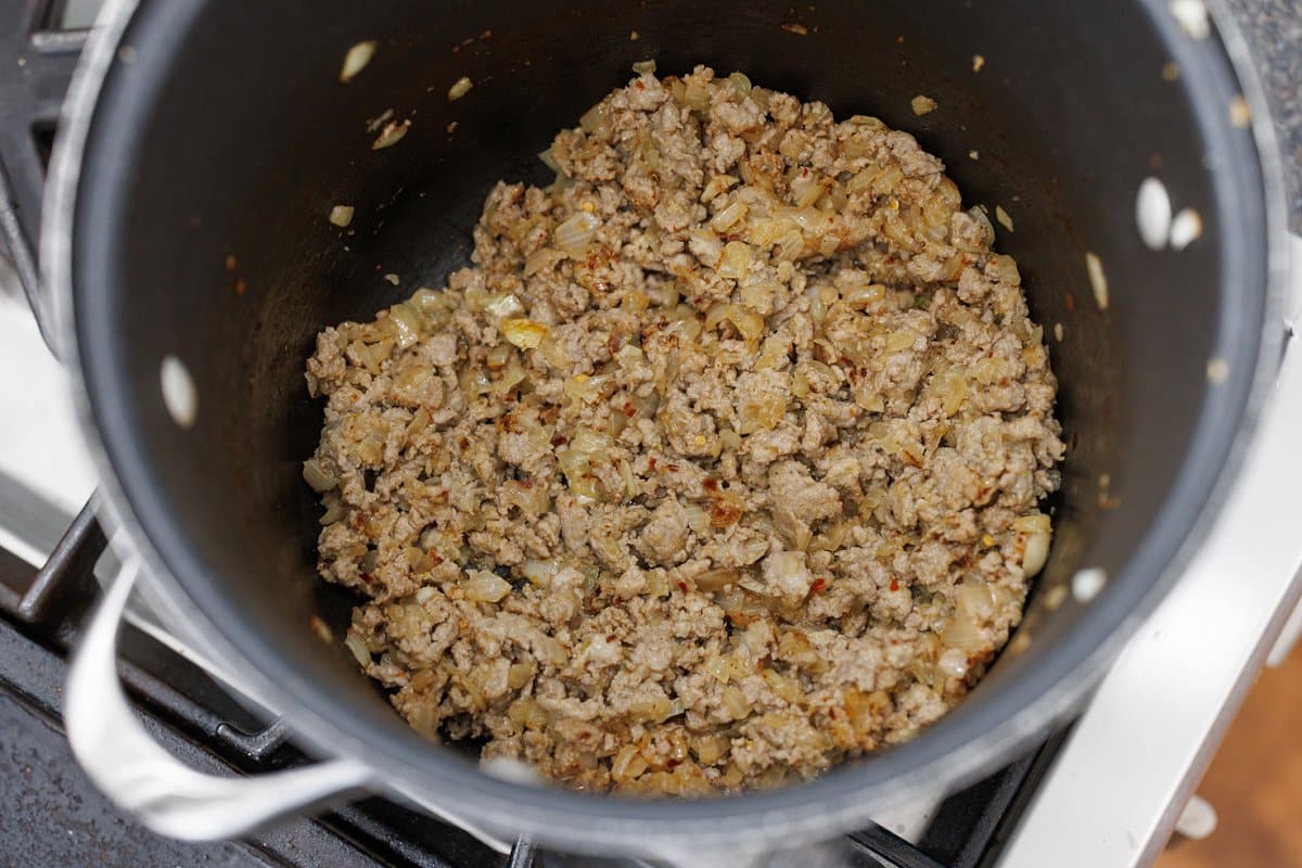 Next add in your Italian sausage and brown it, breaking it up with a wooden spoon. If you like added heat, you could add some red chili flakes here, too.