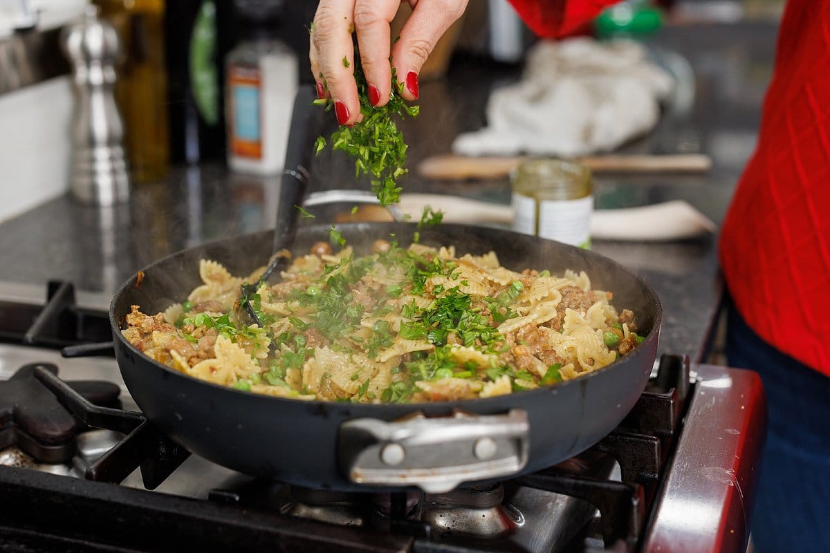 Finish by adding the parmigiano-reggiano and freshly cut parsley atop your pasta dish.