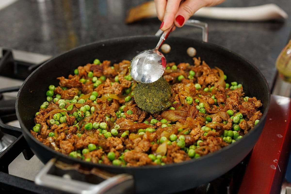 You can heat up your pesto with your pasta, as I do in this recipe, or you can simply layer it on after the pasta or meat is done cooking.
