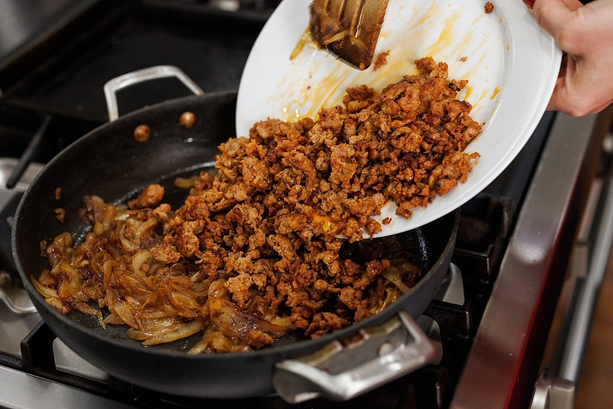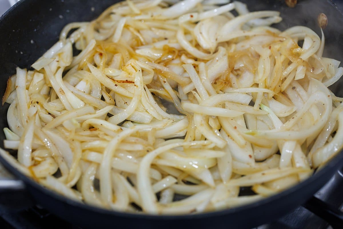 Next, add some olive oil and the sliced onion to the same pan and cook until caramelized, soft, and browned.