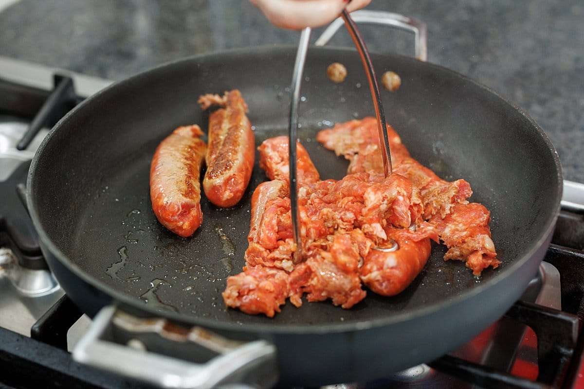 2. While pasta is cooking, heat a large, deep skillet over medium-high heat and spray with cooking spray. Add Italian sausage (ground or casings removed) to the pan and begin breaking down using a potato masher or wooden spoon. Cook until sausage is golden brown, stirring frequently, about 7-9 minutes. Once sausage is fully cooked, remove from the pan and set aside.