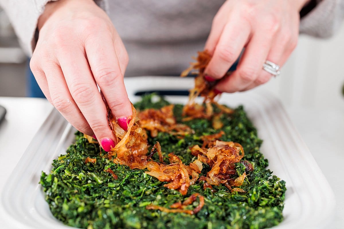 • Add a layer. In-between the greens and caramelized onions, my family will sometimes add a layer of cooked black-eyed peas.