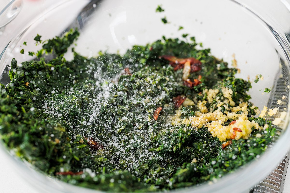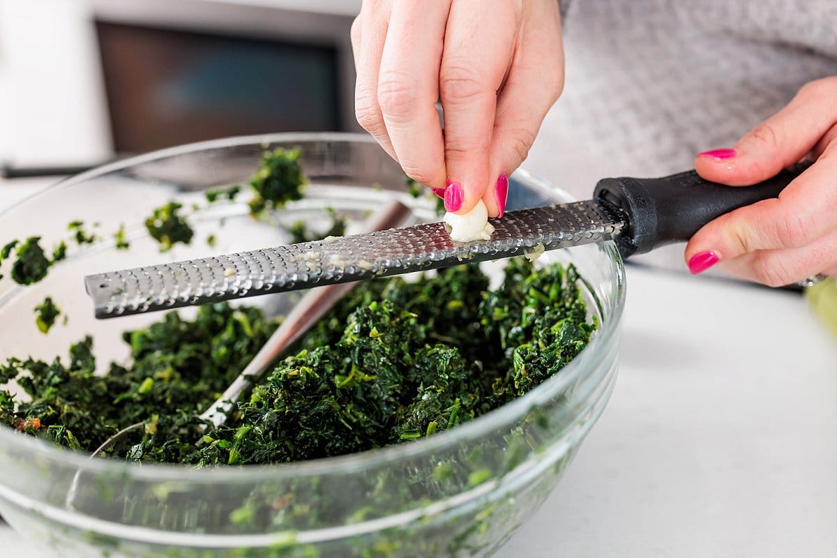 Steam your greens in a steamer pot or in the microwave, being careful not to overcook them. Once they’re bright green, put them in a bowl and using a microplane or cheese grater, add freshly grated garlic.