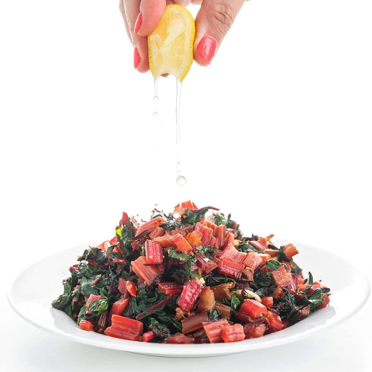 Remove from the pan and plate your sautéed Swiss chard, ideally it hasn’t been in the pan for more than 4-5 minutes total. Grab a freshly sliced lemon and squeeze the juice onto the chard, giving it a good toss, and serve! Again, going for ease, if you don’t have fresh lemon juice, bottled will be just fine.