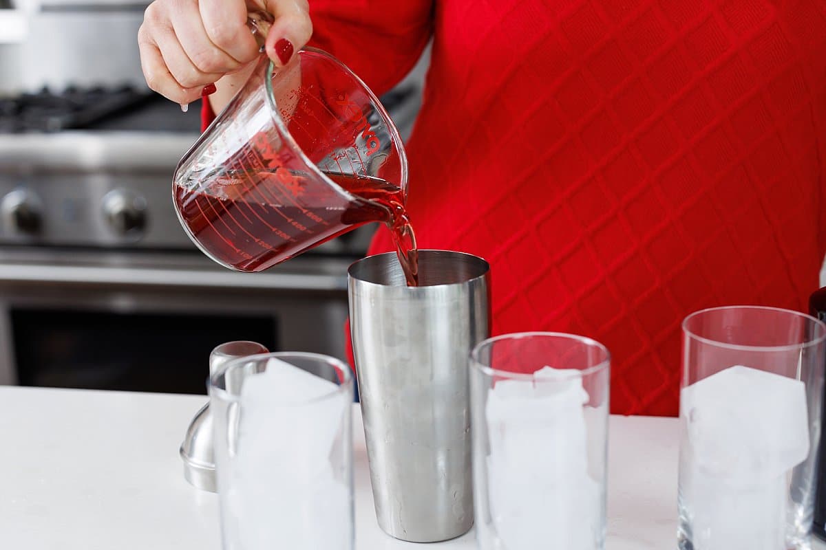 Start by filling four tall glasses with ice, and putting ice in a cocktail shaker. Then pour the cranberry juice into the shaker as well.