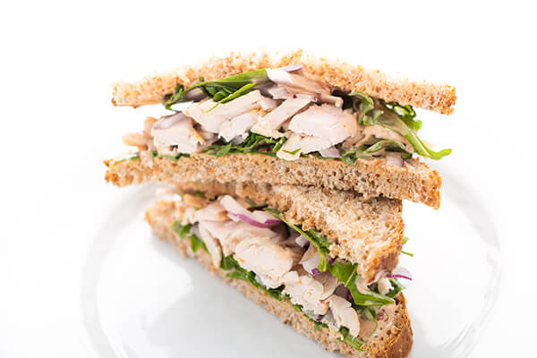 When selecting bread for my sandwiches I love to use whole wheat bread because it provides the ideal combination of fiber and long-lasting energy from the carbohydrates. This, combined with the protein-packed chicken and veggies in the sandwich keep me from sugar crashing an hour after lunch. For more reasons to love bread, click here.